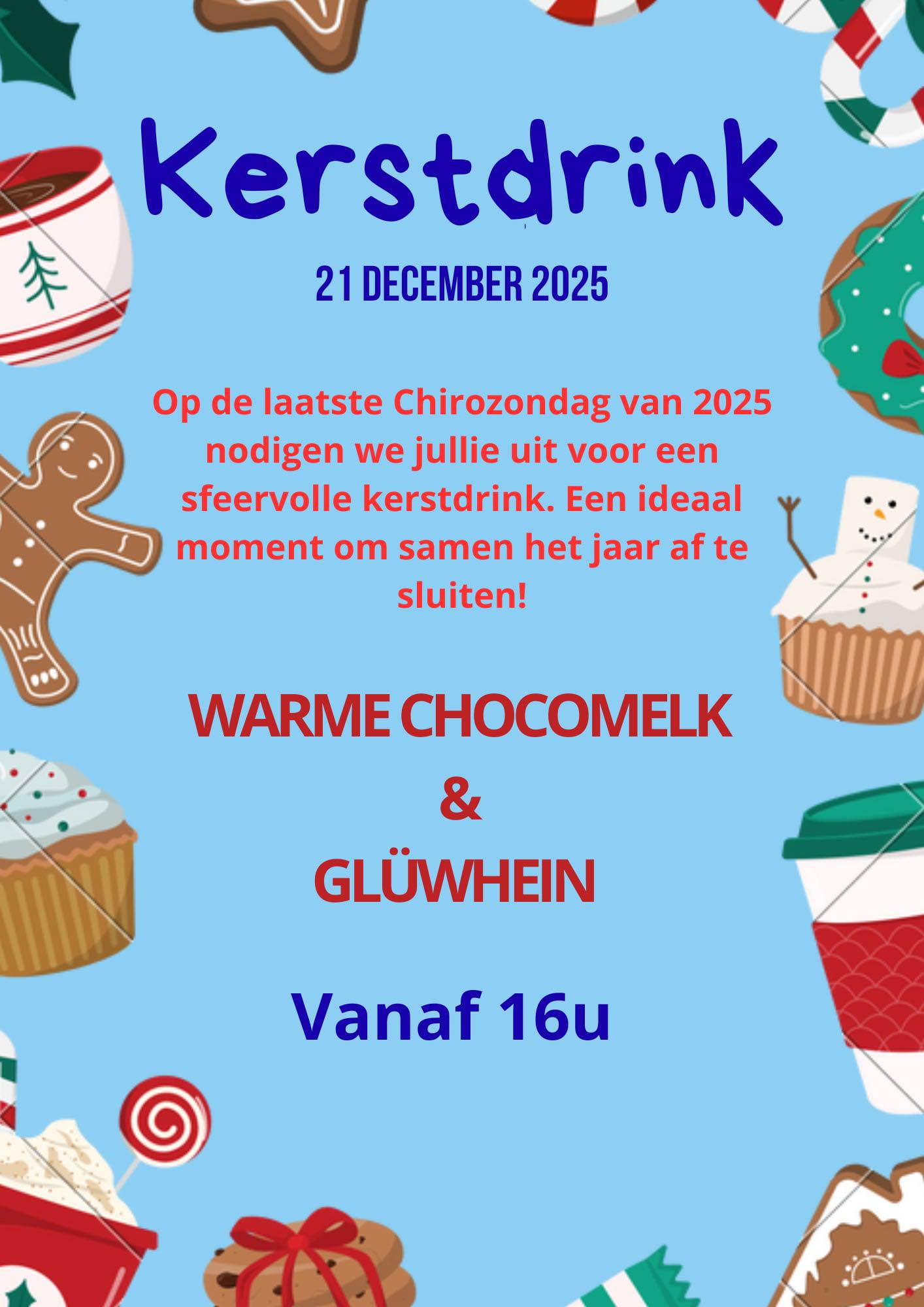 kerstdrink 2025 Posted on 2 december 2025 by chiro_WP_admin We nodigen jullie graag uit om de laatste Chirozondag van dit jaar samen gezellig af te sluiten! Dat doen we met een lekker warm drankje en een fijne sfeer. Vanaf 16u zijn jullie allemaal van harte welkom. Tot dan!
